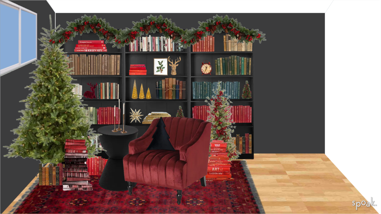 Red accents and tons of books